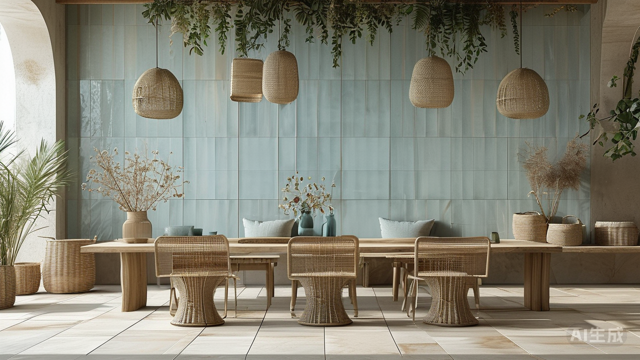 色彩搭配:回归本真的低饱和度世界色彩是塑造侘寂风的灵魂所在。微水泥瓷砖本身的低饱和度特性为其提供了广阔的创作空间。整体色调应以大地色系为主,如沙色、石青色等,这些颜色不仅易于与其他自然元素相协调,还能营造出一种温馨而沉静的感觉。为了避免过于冷淡,可以适当加入一些木质元素的家具或装饰品,如原木色的桌椅、藤编篮筐等,它们既能作为色彩上的过渡,又能增加空间的温暖感。同时,绿植也是不可或缺的角色,一盆简约的花艺或是几株垂吊植物,都能为室内带来生机与活力。